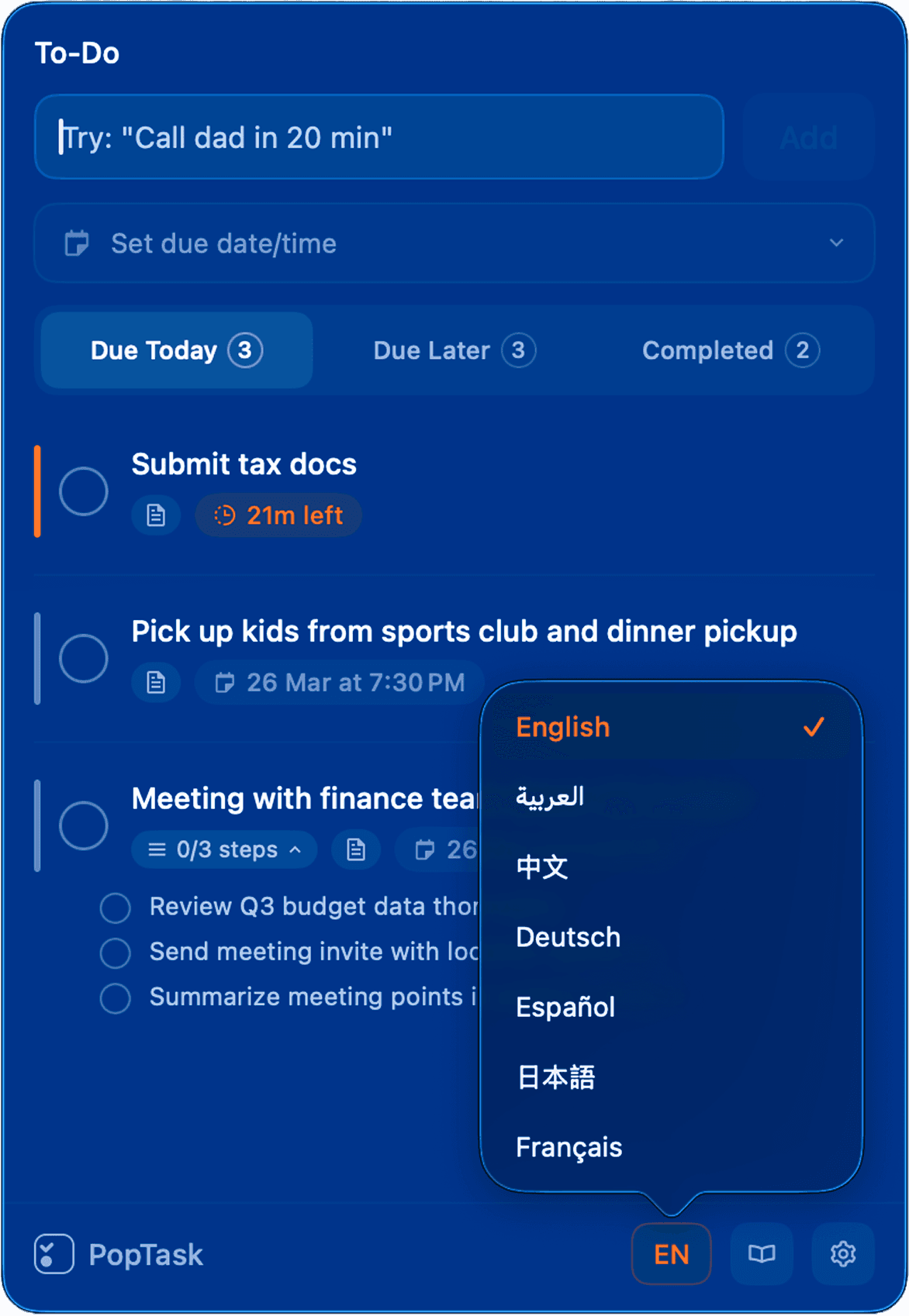 PopTask is not just translated. The input engine understands dates, times, and common phrases in English, Urdu/Hindi (Roman), Arabic (transliterated), Spanish, French, German, Chinese (pinyin), and Japanese (romaji). Type "mañana a las 3" or "kal subah" or "morgen 9 Uhr" and it just works. The full interface also adapts to 7 languages: English, Arabic, Spanish, French, German, Chinese, and Japanese.