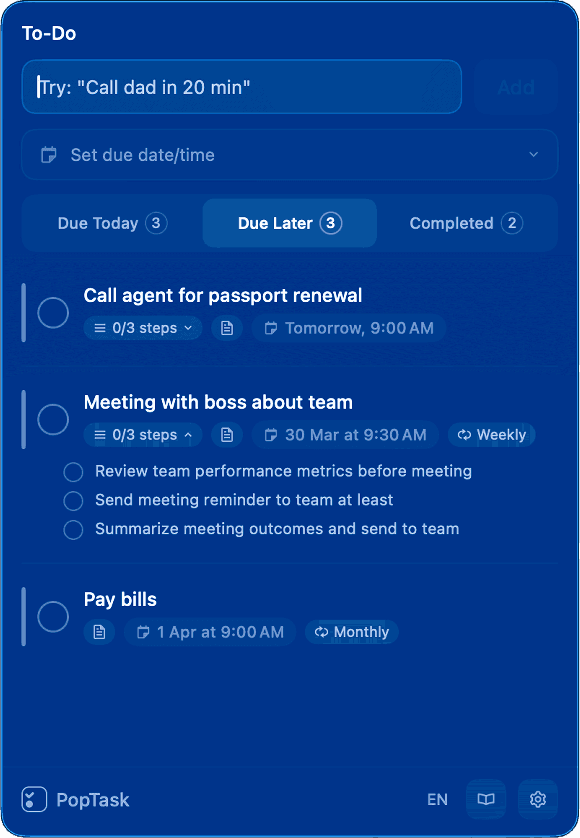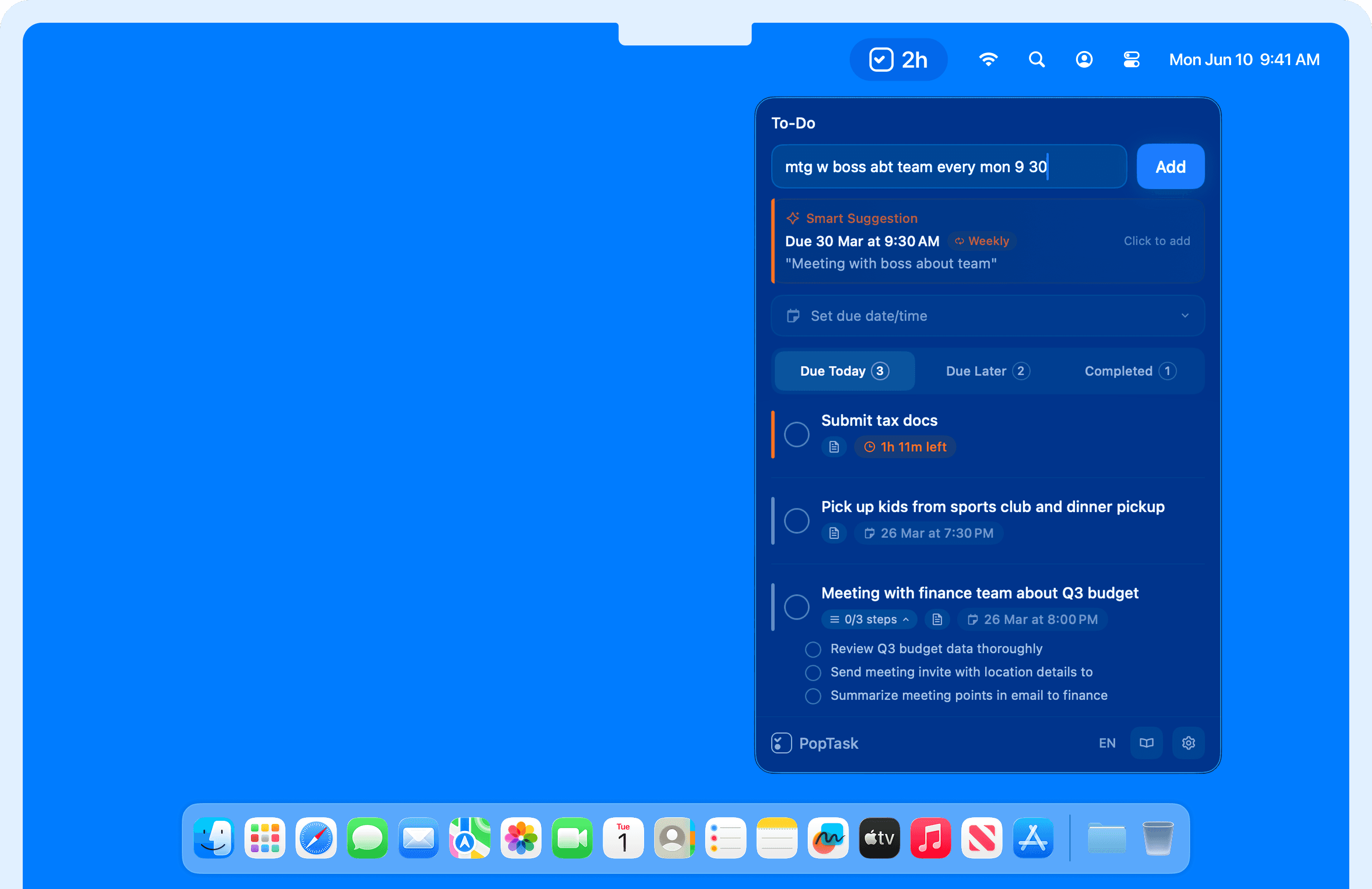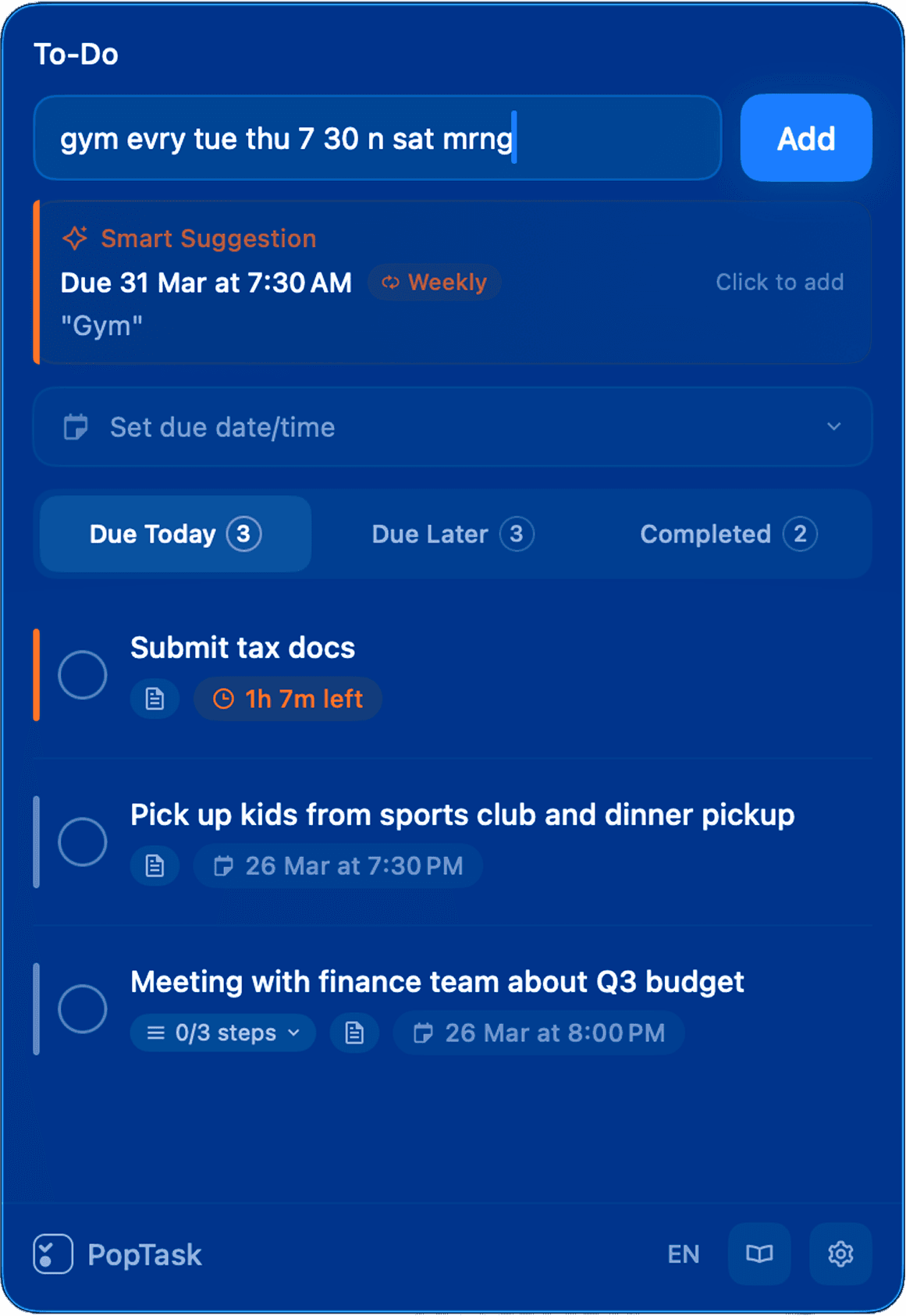 Type tasks exactly how you think them. "Call dad in 20 min" or "dentist Friday at 2pm" or "submit report eod." PopTask figures out the title, the date, and the time automatically.Slang and abbreviations like "tmrw," "eod," "mtg," and even non English input like "kal subah" or "mañana" are understood out of the box. For anything more complex, like recurring tasks or vague dates, cloud AI picks it up in the background. You see a live preview of the parsed result before you confirm, so there are no surprises.