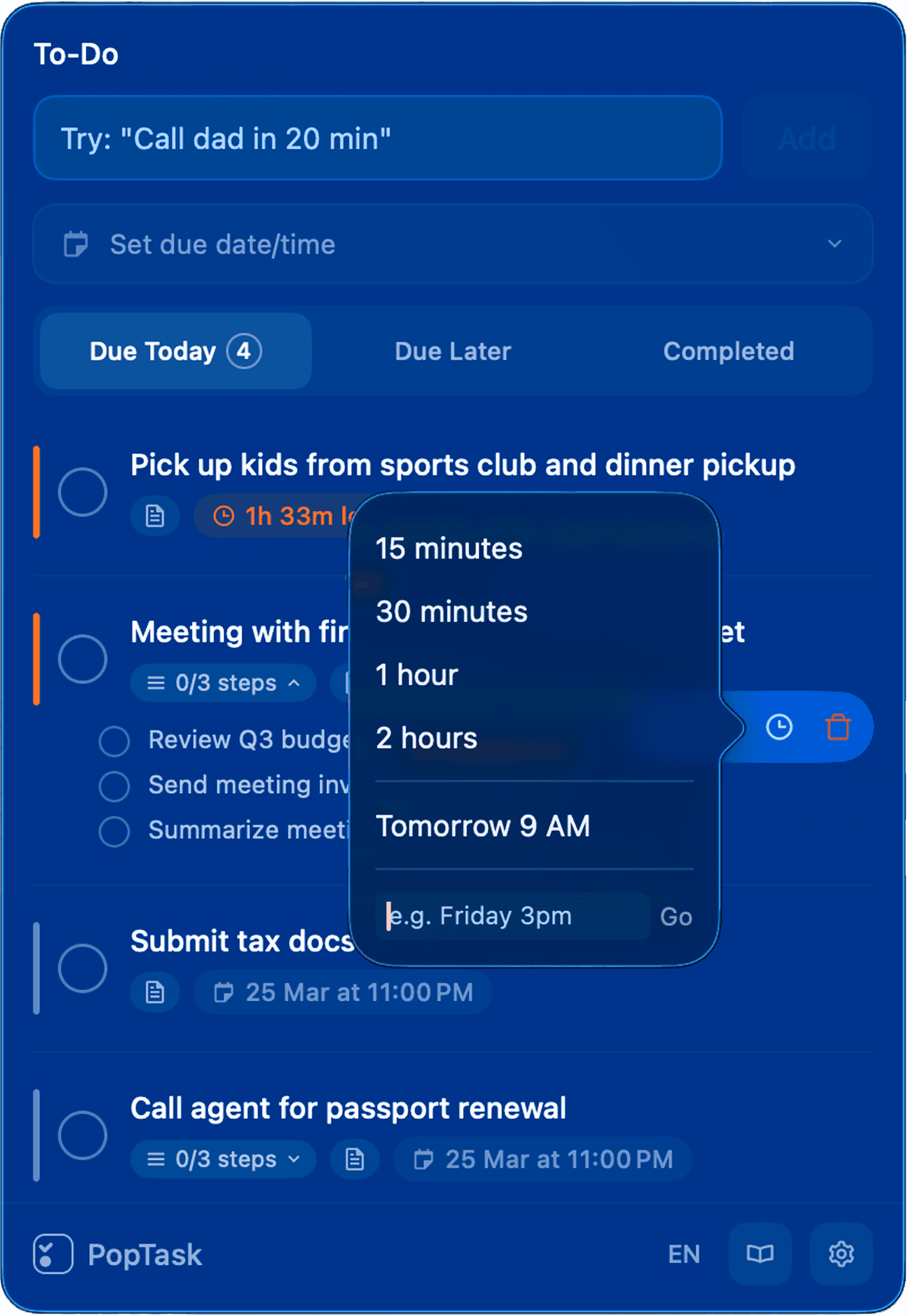 Some tasks come back every day, every weekday, every week, or every month. Set a recurrence rule and PopTask automatically creates the next occurrence when you complete one. The new task carries over your subtasks and original title.When something is not urgent right now, snooze it. Use presets like 15 min, 1 hour, or Tomorrow 9 AM. Or type anything into the snooze field, like "Thursday 3pm" or "in 2 hours," and PopTask parses it the same way it handles new tasks.